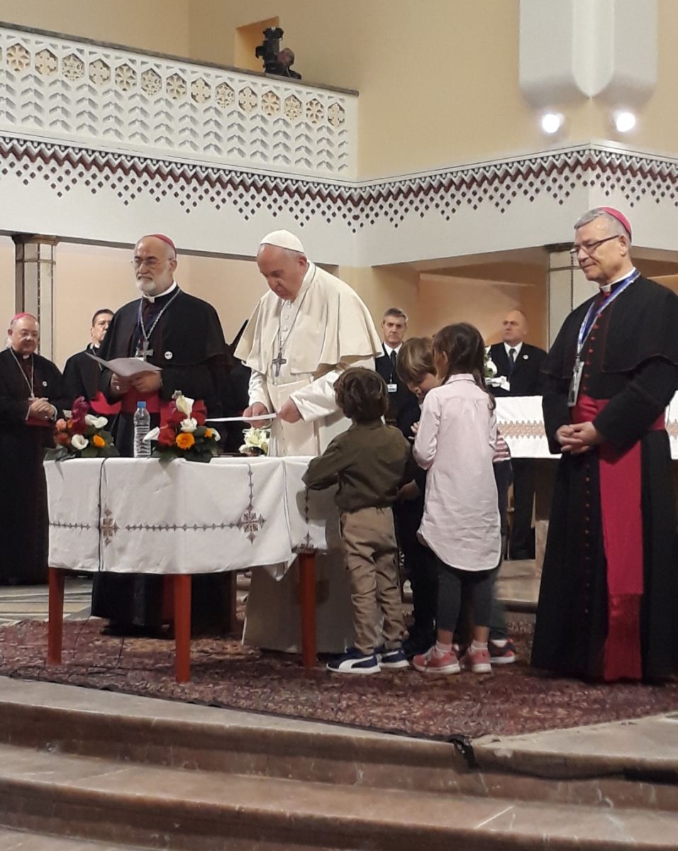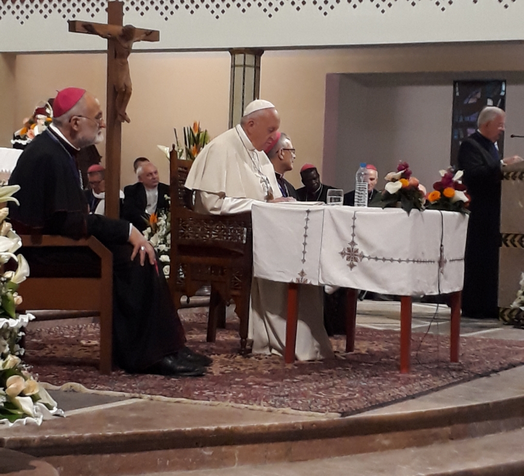 Le pape a écouté deux témoignages, l'un présenté par prêtre Jermane et le second par la prêtresse Marie, les remerciant pour le partenariat vécu ici au Maroc entre les chrétiens de différentes groupes sur le chemin de l'unité.