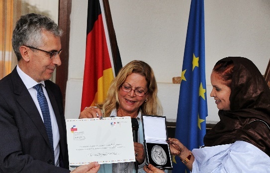 Mekfoula Brahim, recevant le prix franco-allemand des mains de l'ambassadeur français et de son homologue allemand. Crédit : Mozaikrim/MLK