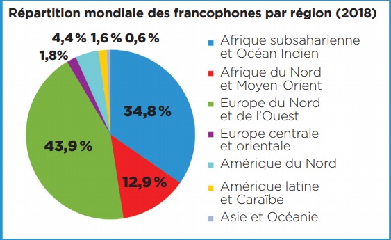 Globalement, l’Afrique du Nord abrite 12,9% de francophones, derrière l’Europe du Nord et de l’Ouest (43,9%), et l’Afrique subsaharienne et l’Océan indien (34,8%).