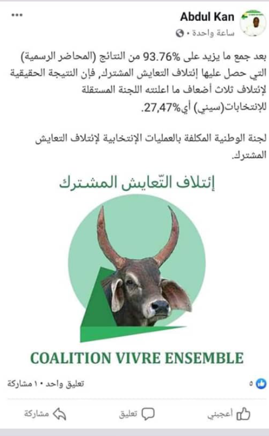 Le chargé de Communication du candidat a posté à ce propos sur sa page facebook un tweet, selon lequel, KHB a obtenu, après le dépouillement de plus 93,76% des PV officiels, trois fois plus que les résultats annoncés par la Commission Electorale Nationale Indépendante (CENI), soit 27,47%.