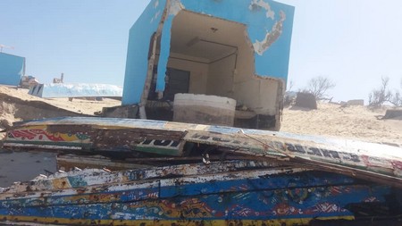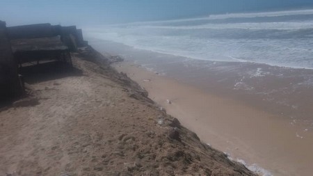 Pire encore, chaque année, entre novembre et février, de grosses houles s’abattent sur le cordon dunaire, qu’elles corrodent méthodiquement, poursuivant ainsi leur travail de sape. Ce faisant, nombre d’habitations se trouvant à l’Ouest du village sont allées à vau-l’eau en un temps record, tandis que celles qui tiennent encore debout attendent pathétiquement leur tour.