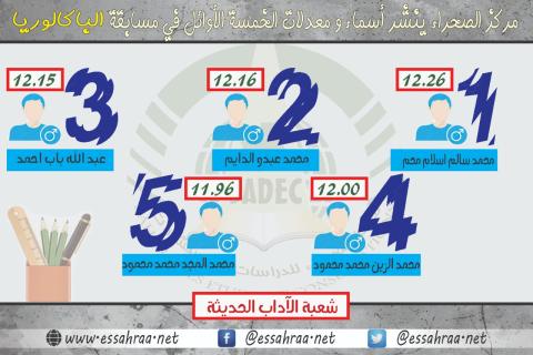 و في هذا الصدد أعد القسم الفني بمركز الصحراء انفوكراف بأسماء و معدلات الخمسة الأوائل في شعبة الآداب العصرية، حيث حل أولا التلميذ محمد سالم اسلام محم بمعدل 12.26 تلاه التلميذ محمد عبدو الدايم بمعدل 12.16، و جاء التلميذ عبد الله باب أحمد في المرتبة الثالثة بمعدل 12.15 و محمد الزين محمد محمود رابعا بمعدل 12.00، بينما احتل المرتبة الخامسة التلميذ محمد المجد محمد محمود بمعدل 11.96.