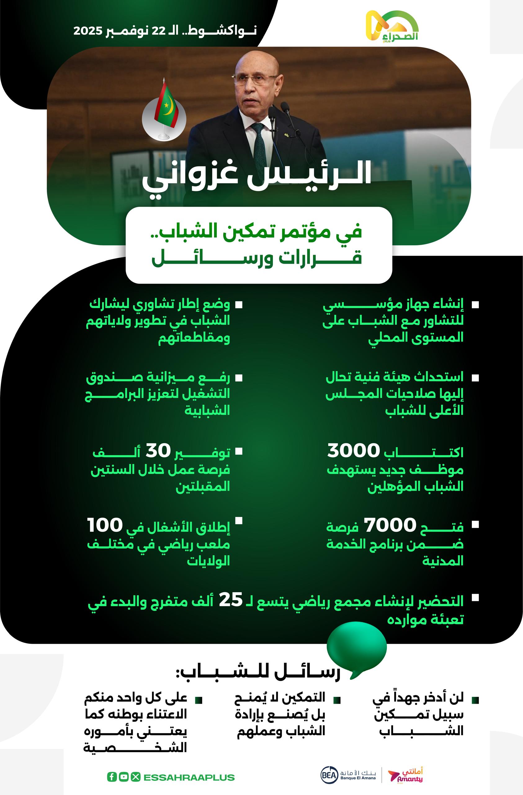 أعلن الرئيس محمد ولد الشيخ الغزواني، في خطابه بمناسبة عيد الاستقلال، جملة من القرارات الاجتماعية والاقتصادية من أبرزها زيادة رواتب مدرسي ومفتشي التعليم الأساسي والثانوي والفني، إضافة إلى أفراد القوات المسلحة وقوات الأمن.