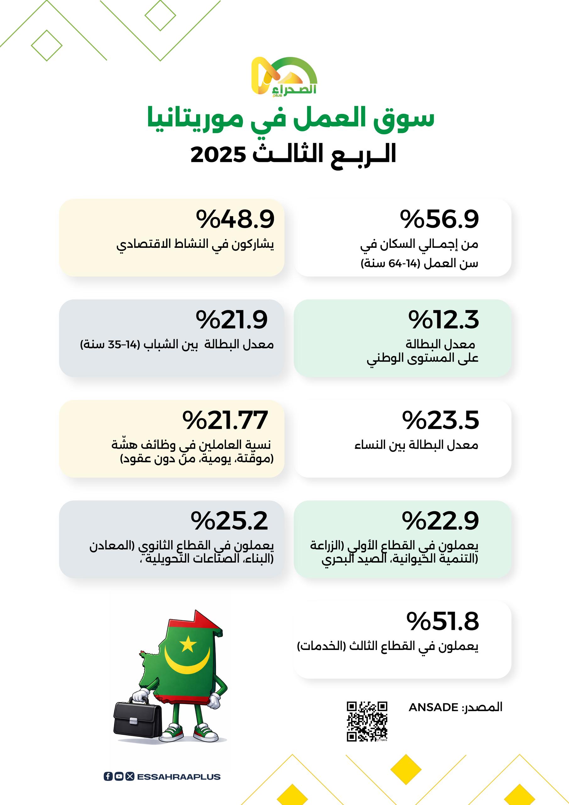 أظهرت الإحصاءات الرسمية أن 56.9 في المائة من إجمالي السكان في موريتانيا هم في سن العمل (14–64 سنة)، فيما بلغت نسبة المشاركة في النشاط الاقتصادي 48.9 في المائة.